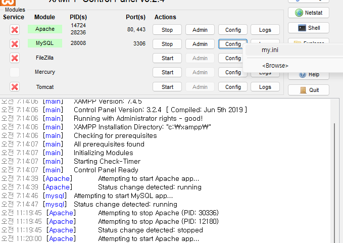 1) xampp control panel을 종료하고 관리자 권한으로 실행한다.